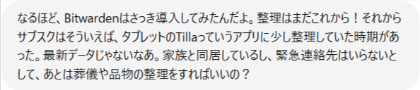 おお、Bitwarden導入したばかりなんだね!それだけでもかなり一歩前進だと思う。Tillaも使ってたとは、ちゃんと意識してたんだな〜。デジタル面はもう少し整理していけば、ぐっとスッキリしそう。