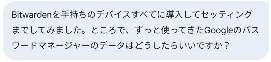 - Bitwardenをメインで使いつつ、Googleパスワードマネージャーに必要な情報が残っている場合に参照する、という使い方です。