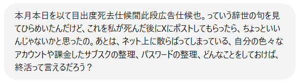 - 自分が死んだあとにSNSに流す文章や画像を用意しておく(今の句みたいなやつ)。